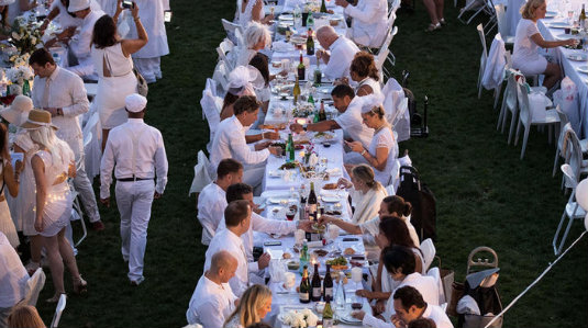 Guests must bring: A table, two (white) chairs, white tablecloth. A picnic basket comprising fine food and proper stemware and white dinnerware.