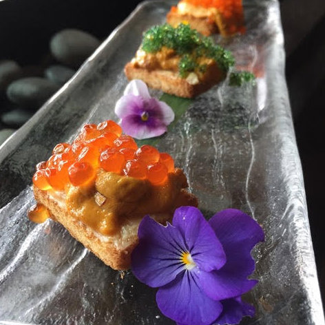 Uni Toast – Japanese Bread, Uni, Japanese Garlic Butter Sauce, Red Caviar, Green Caviar, Black Caviar.