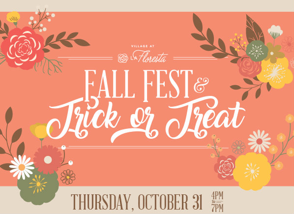 The Village at La Floresta in Brea celebrates Halloween with a FREE Fall Fest & Trick or Treat Event, sponsored in-part by Pearl La Floresta on Thursday, October 31, from 4 to 7 p.m.