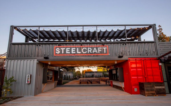SteelCraft Garden Grove, the newest open-air craft food and drink gathering space in Orange County just opened. The 20,000 square-foot urban eatery is comprised of 22 repurposed shipping containers, an agricultural-inspired open-air roof structure, and a vintage video arcade. It’s home to nine small craft food + drink businesses: Beachwood Brewing, Dark Horse Coffee Roasters, Cauldron Ice Cream, Honey & Butter Macarons, The Nest: A Breakfast Joint, The Chick ‘N Shack: Khao Man Gai, Barrio: Modern Filipino BBQ, Renegade Taco and The Penalty Box.