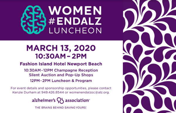 Join us to change the trajectory of Alzheimer’s disease and all dementia at the Alzheimer’s Association WOMEN #ENDALZ Luncheon on Friday, March 13 from 10:30 a.m. to 2 p.m. at the beautiful Fashion Island Hotel in Newport Beach. This festive event features a Champagne reception, silent auction and pop-up shops from Lilly Pulitzer, SEED Peoples Market and Gorjana.